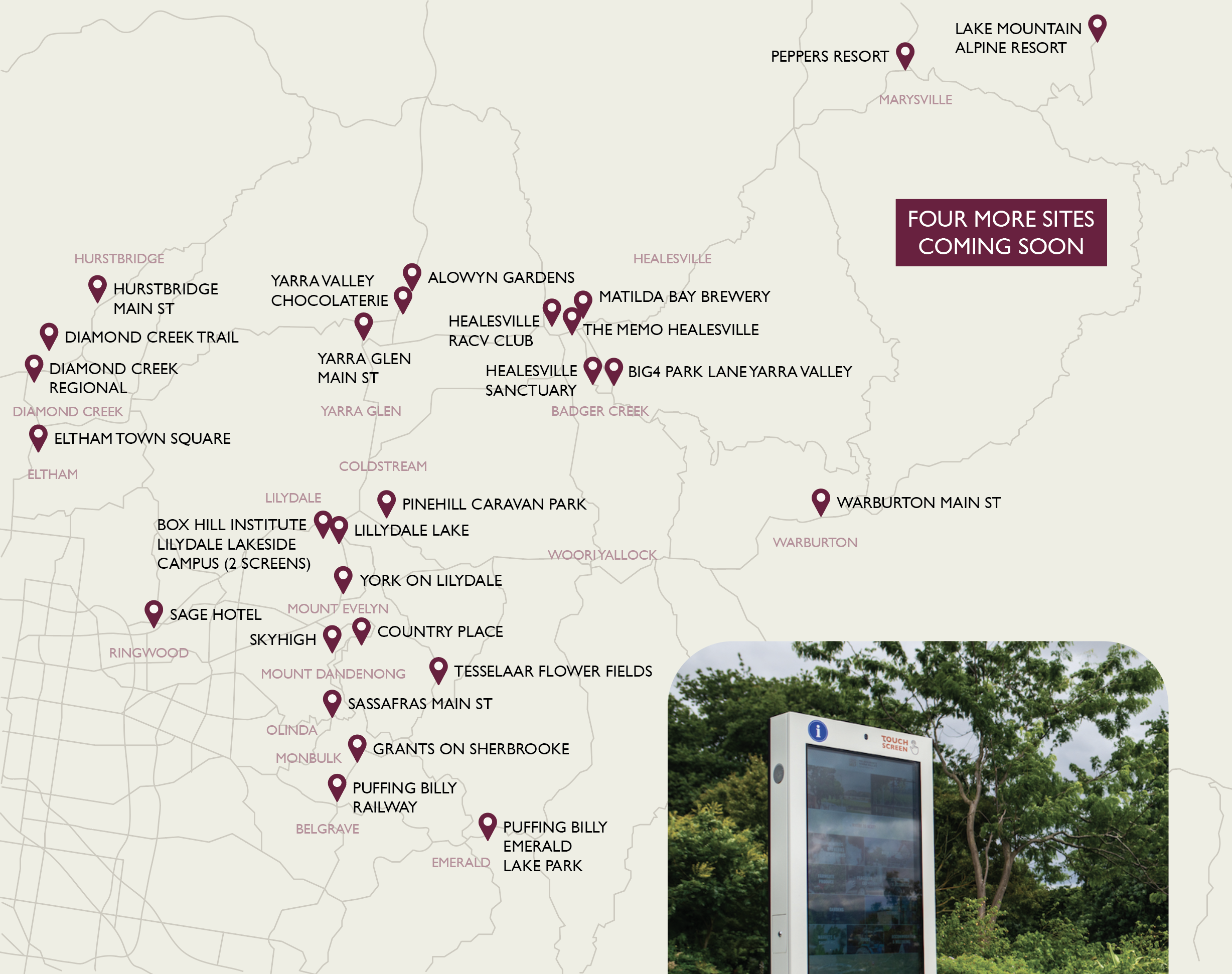 The Digital Visitor Information Kiosk network has been established by Tourism East as an Australian first in touch screen technology to attract visitors to do more and see more when in the Yarra Valley and Dandenong Ranges. They provide a high-impact and engaging visual format to strengthen your brand, product, business or event.